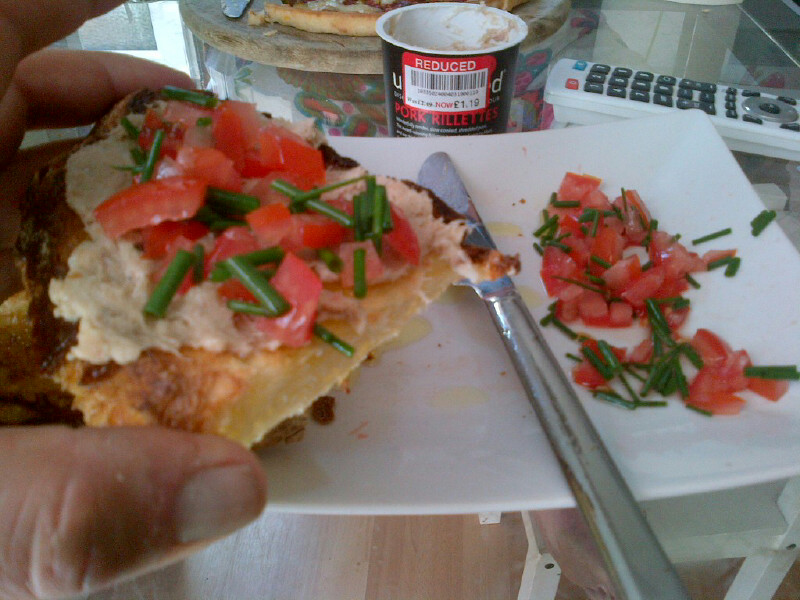 So onto lunch.. Pork rilletes on toasted italian bread.. With some chopped tomatoes and garden chives.. Nice .. Very nice! Couldn’t eat it all though! A little too rich!