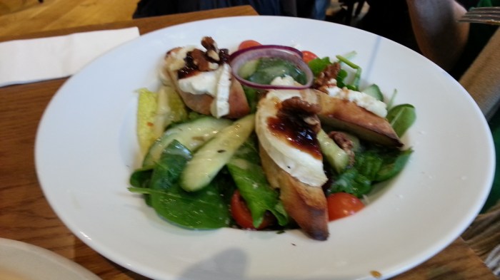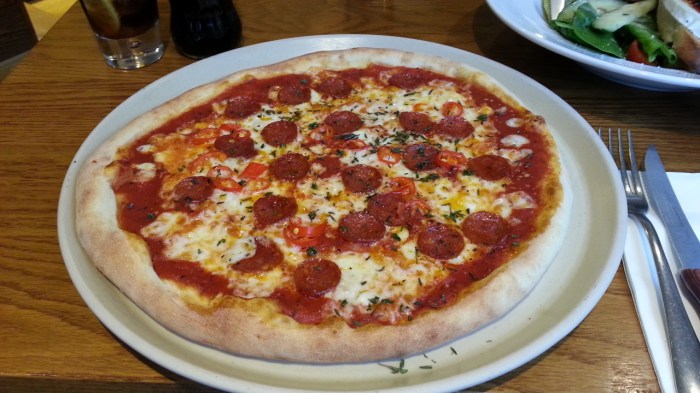 I chose the pepperoni pizza with red chillies and thyme and Christine chose the Goat’s cheese salad. Both courses were superb. Of course I had to get a doggy bag for mine.