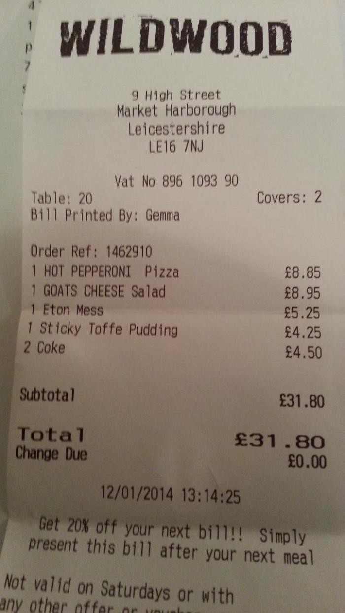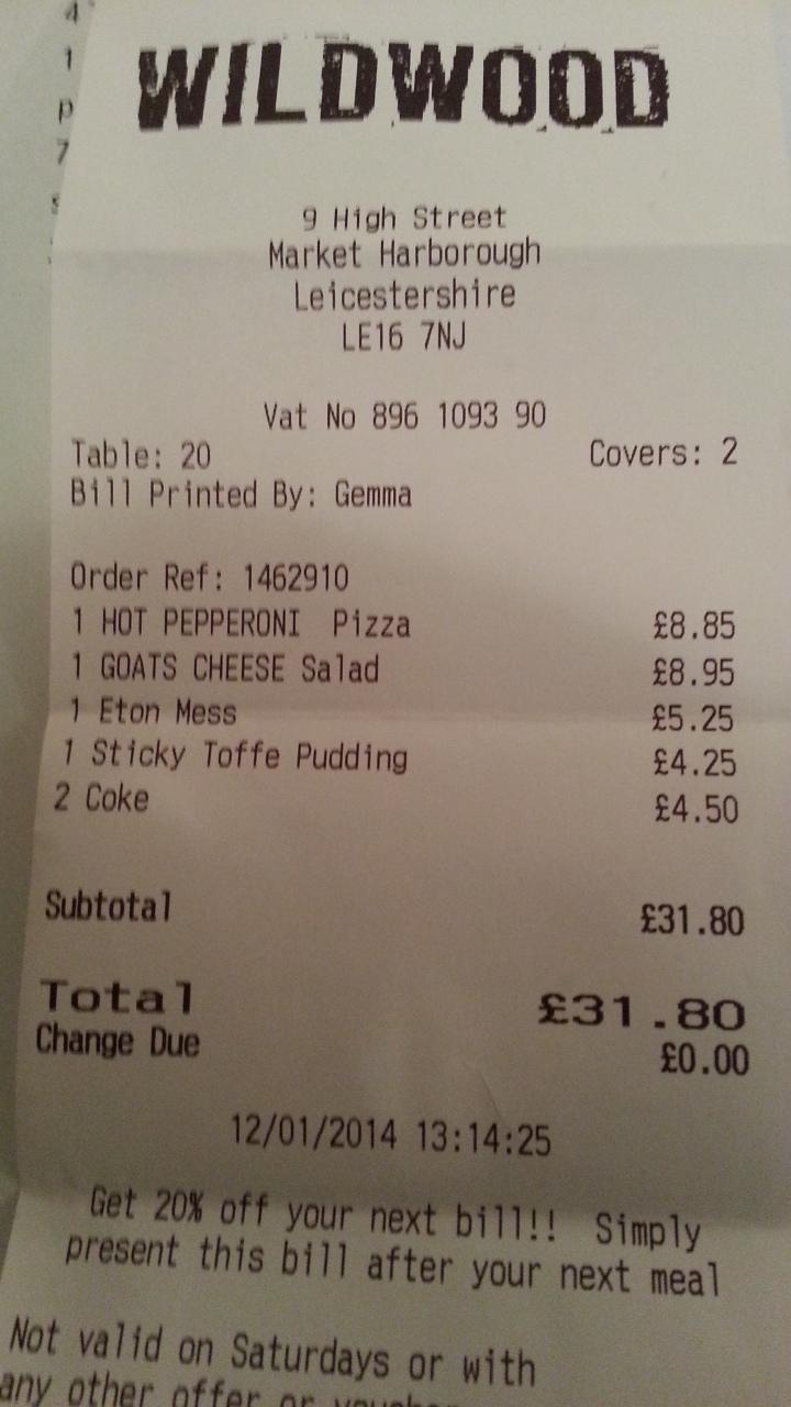 Came across a lovely restaurant & bar called Wildwood. Absolutely spotless and a genuine welcome from a really pleasant waitress with a smile who found us a table.