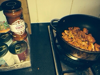 Also had some marinated chicken fried chopped in the freezer to get out to defrost. Another store bought jar of tikka sauce added simply placed in a glass dish and popped into the oven with the curry for 40 minutes