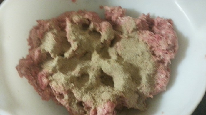 To this I added a good handful of medium oatmeal ( pinhead) and about half of that of Japanese bread crumbs (panko), gave it a good mix with my hands until thoroughly integrated.