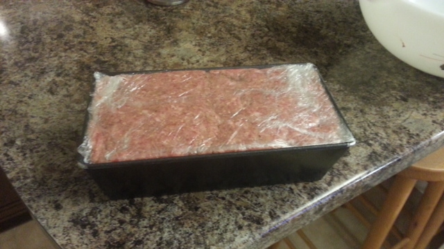 Line a loaf tin with cling film and pack the meat tightly into the tin, removing as much air as possible.