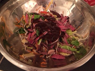 A simple bag of store bought Chinese mixed veg the kind sold for stirfries yet quite a good one with water chestnuts and bamboo shoots also..with addition of some frozen peas ..