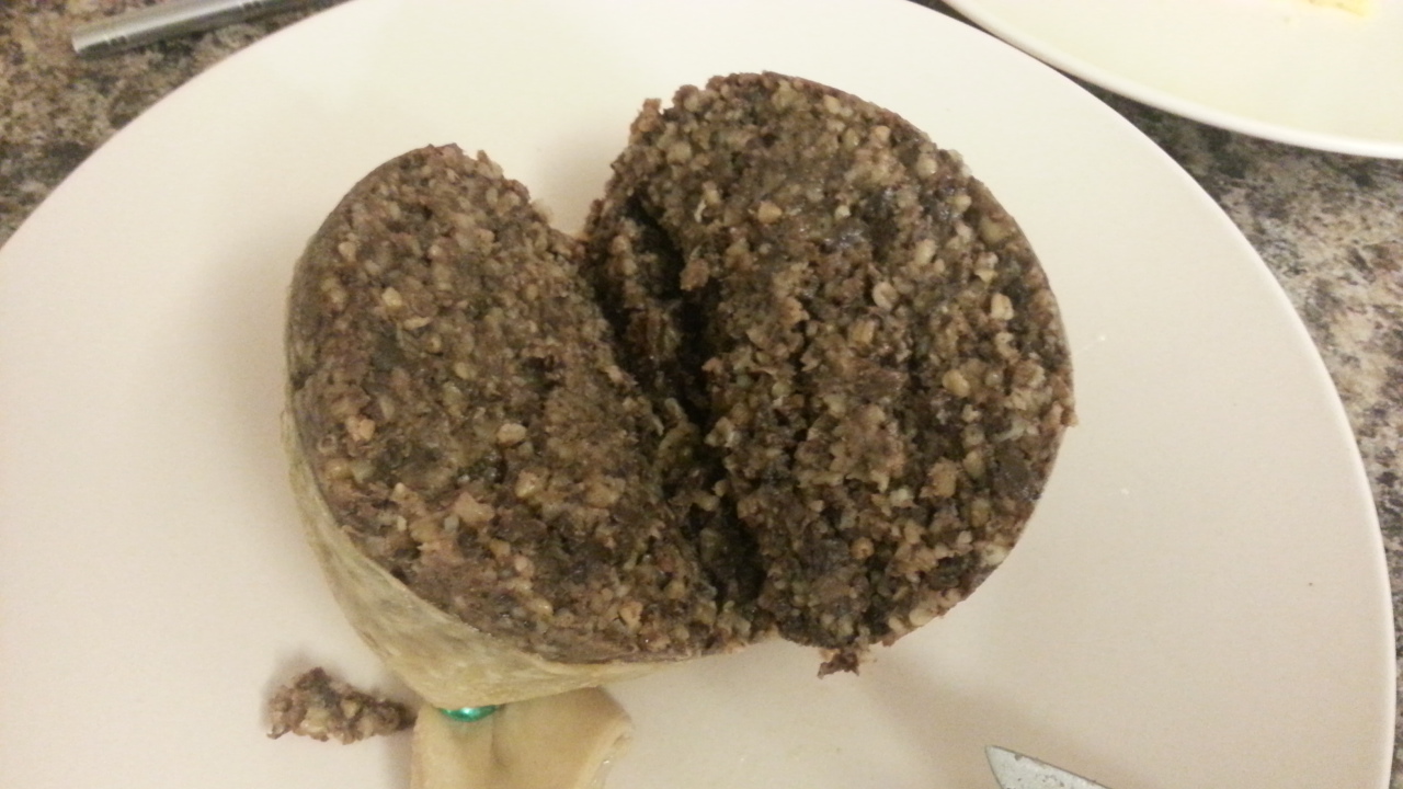 After boiling, the haggis is removed and placed on a plate ready for serving. At a formal Burns Supper the haggis is piped in by a Scottish piper in full dress. What a sound and waht a site. Just thinking about it brings a tear to my eyes and makes the hairs on my neck stand up. Ooo.