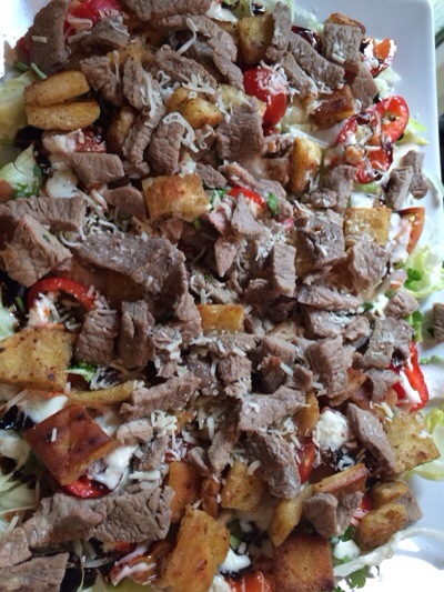 And then the roast sirloin .. Left over from Sunday.. With chopped iceberg, red Romano, last roscoff onion, some Italian fine three cheese mix from the top freezer.. Freezes real well that..