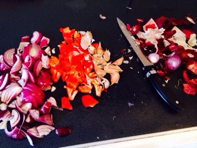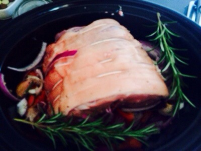 Many of the posts talked about onions and other things . I have gone for red onions a Romano pepper and a head of roscoff garlic, some thyme and rosemary, a splash of pork stock and plonked the meat on top ., turned on high setting