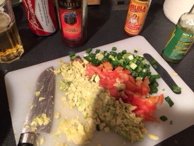 The pinnacle for this dish? Ripe avocados .. Scooped and chopped .. With green onions.., (remember the tune??).. Hard tomatoes.. Roscoff garlic Minced in the wonderful garlic press we have searched for for years.. It’s just like the one we had in lanzarote.. It just crushes the garlic so well indeed ..