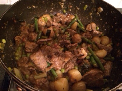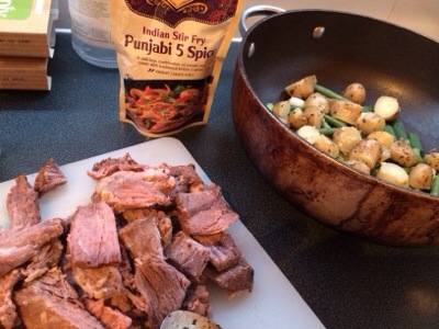 Gone for trimming the beef of fatty gristly bits.. Frying the scallions with some roscoff garlic, pressed with the new wonderful garlic press . Some olive oil . The trimmed roast rib if beef added, the green beans topped and tailed and some frozen peas..