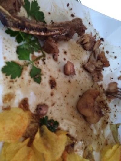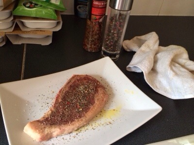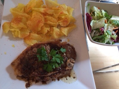 First a sirloin on the bone.. Simply cooked after rubbing with chilli salt and Bristol blend pepper.. Finished with butter .. Served with Spanish olive oil potato chips/crisps.. Warmed in the oven and dusted with umami rush powder.. And a simple use up salad with Italian dressing.