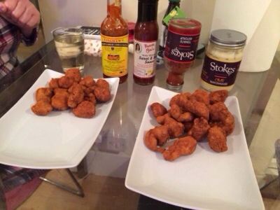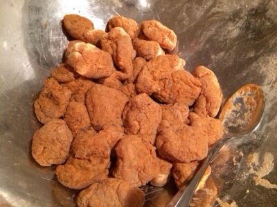 Free range organic chicken breast chopped into chunks into a bowl of water and triple coated in hot and spicy chicken coating.. Good one this!!