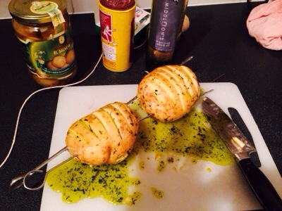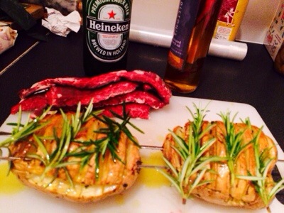 To go with the mouthwatering delight? Hassleback potatoes.. Good ‘muddy’ spuds for this . Cuts made into the spud.. Skewered and coated in Mrs Middletons pimped Lebanese herb oil .. Wild fresh rosemary spears popped into the cuts.. Cooked till crisp.. These are great.. It’s like a multi spudula .. Fries, baked and semi roast all in one .. How cool is that!!!