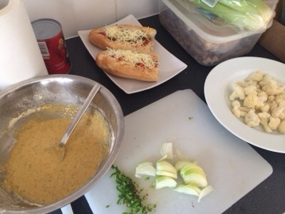 For the ‘filling’ chopped white onion, cauliflower , Turkish red pepper, sweet rocket leaves taken from the garden ( nice day today although a little cold) .. And a couple of shallots… All mixed up..