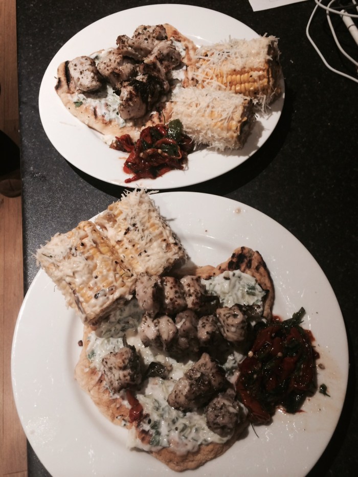 > Griddled cobs rolled in lime and paprika mayonnaise then grated Parmesan (sorry) >