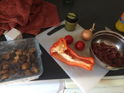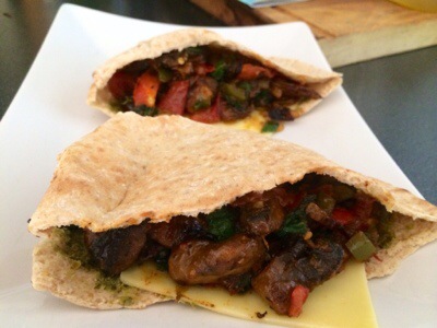 The top freezer donated a pitta from the warbuton family.. Cool.. Toasted it.. Split and a smuckering of chermoula paste .. A slice of Jack cheese and piled the mushroom, onion, pepper, tomato, sweet rocket mix into the pittas..