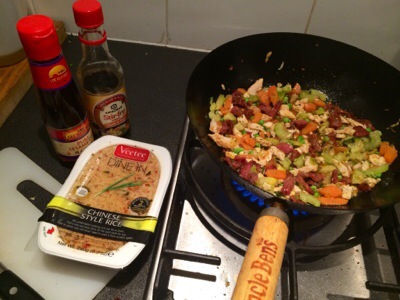 So.. We have the garlic chicken .. A stick of chorizo that once you cut the mouldy looking bits off will be fine.. Some celery.. Left over sprouts and carrots .. Some frozen petit pois.. A frozen piece of ginger and a shallot..
