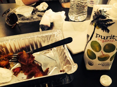 Breakfast.. Morton Williams.. Bacon sausage and breakfast potatoes.. Washed down with a delicious organic coconut water..