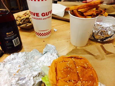 Lunch.. Just had to be Five Guys.. Mrs Fitz has never had a Five Guys., if you have read prior posts or fancy writing Five guys into the search box on cookingwithmrfitz.com then you will see that I dig this burger bar as right up there. Some ghe about their honesty.. The very good fries.. Very good indeed .. And the burgers are just easy to eat..