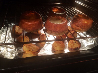Gotta be Yorkshire puddings! Made the batter adding kalonji seeds and herb de Provence .. Into the top oven in heated oil to raise away.. I was happy with how they turned out yet I really do need to get myself a new Yorkshire pudding tin.. As I am using a muffin tin and it does take longer and produce a slightly more cakey kinda finish..
