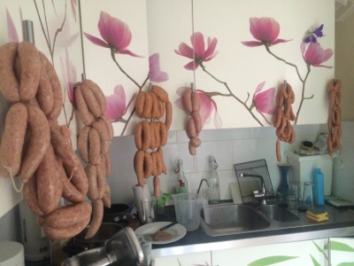 Blended and stuffed into the hog casings . Twisted and hung to settle on the kitchen cabinets . ( thank goodness Mrs Fitz was out huh!?) ha ha ha x