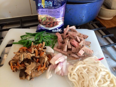 Chopped beef, roscoff onion , French beans, udon noodles, mixed mushrooms and a sachet of oyster and spring onion sauce courtesy of blue dragon..