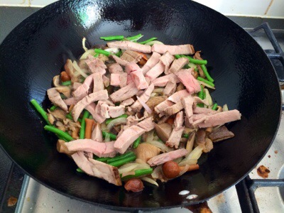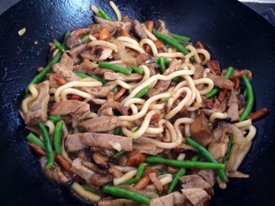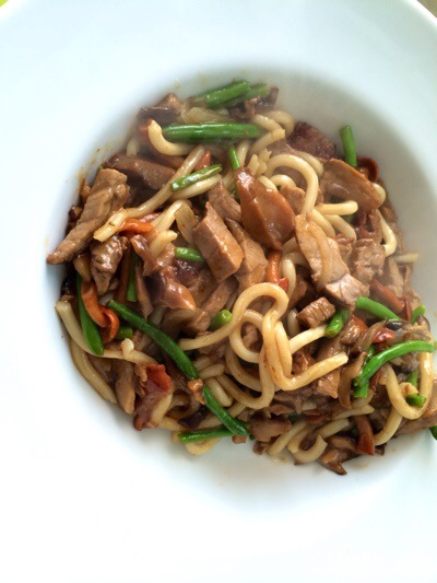 Top rump beef and mushroom with French beans and udon noodles in oyster and spring onion sauce..