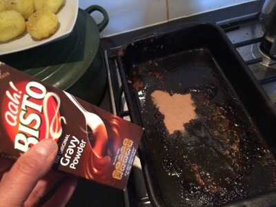 Oh ! The gravy! leftover gravy found in the top freezer.. With the addition of more veal powder .. Bisto powder added to the tin that held the meat . scrape scrape .. adding the boiled up gravy and veal powder.. Just an extra splash of water to thin it out a bit..