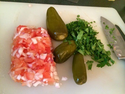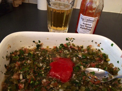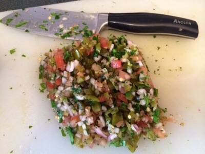A tomato, roscoff onion, some jalepenos , parsley, coriander, mint, all gets chopped up.. Added to white wine vinegar and olive oil .. a drop of red pepper ketchup at the end . a lovely fresh salsa to pair with the lamb chilli..
