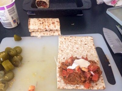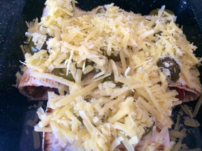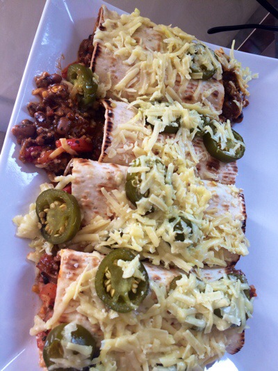 Wraps.. Kinda wraps.. Taken some great flatbreads from the warburton family bakery.. placed the chilli atop.. whooped up a fresh salsa .. added some sour cream. (all of this being use up products ).. rolled up topped with cheese and jalepenos . Into the oven to cook through..