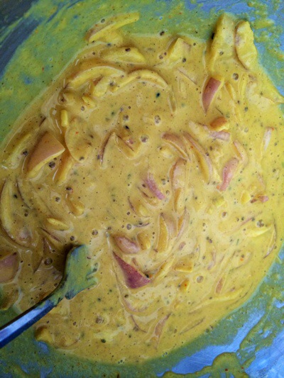 Added gram flour and a pinch of baking powder . I add a pinch of baking powder as the gram flour can go a bit too heavy otherwise..