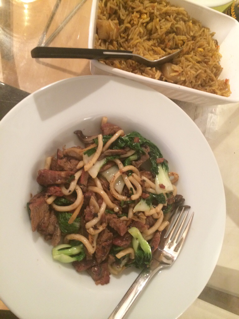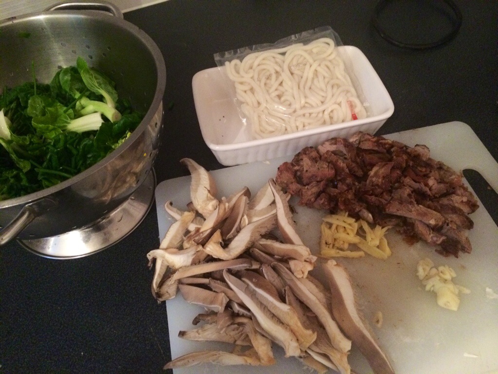 Following the same pattern . Pak choi oyster mushroom ginger garlic and chilli oil.. Udon noodles and the lamb. A splash of soy sauce. A sprinkle of broth powder and that was it..