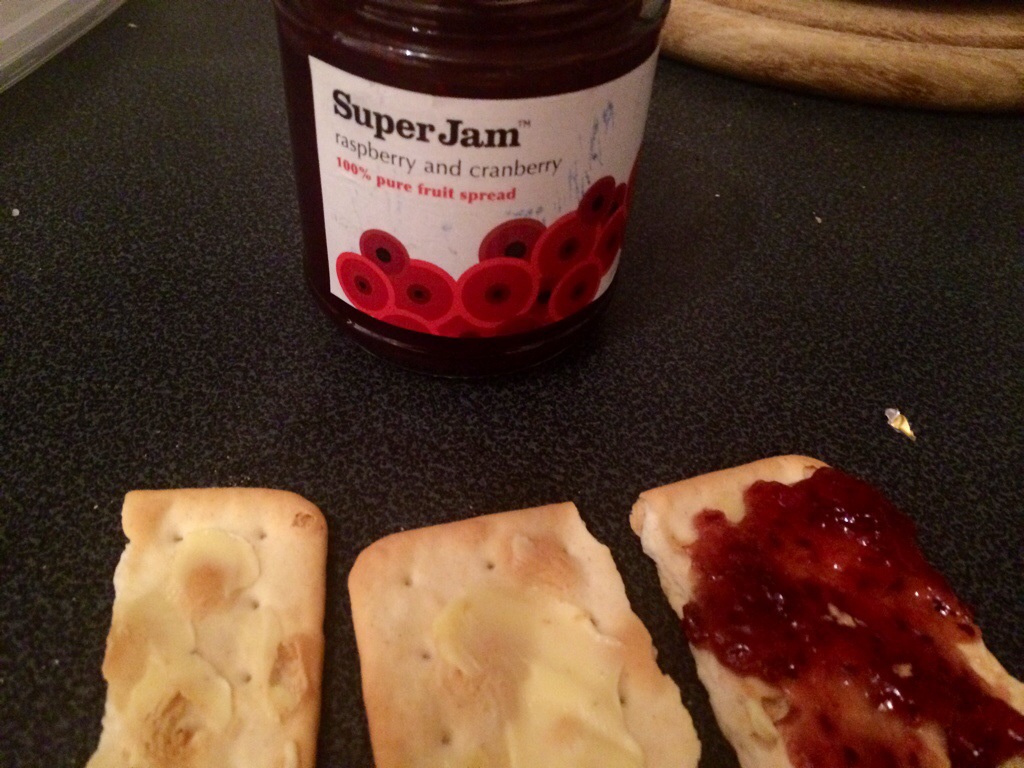 And for dessert? Cream crackers with butter and super jam . I sent a pic over to my attorney.. he already thinks I’m crackers! mailing back asking if we were out of good in the house!