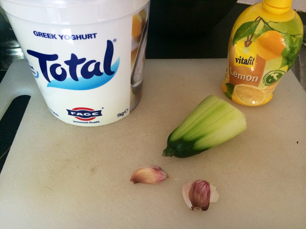 A couple sauces are required here.. A garlicky cucumbery lemony salty number.. Simple with Greek yoghurt..
