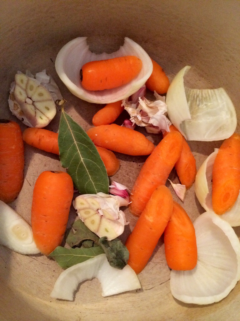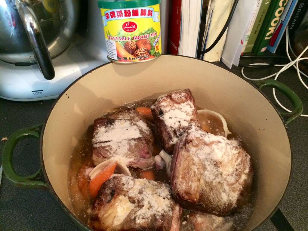 seared in a pan.. Added to a cresuet with carrots, onion peelings, garlic and mushroom broth powder.. Some water to help.