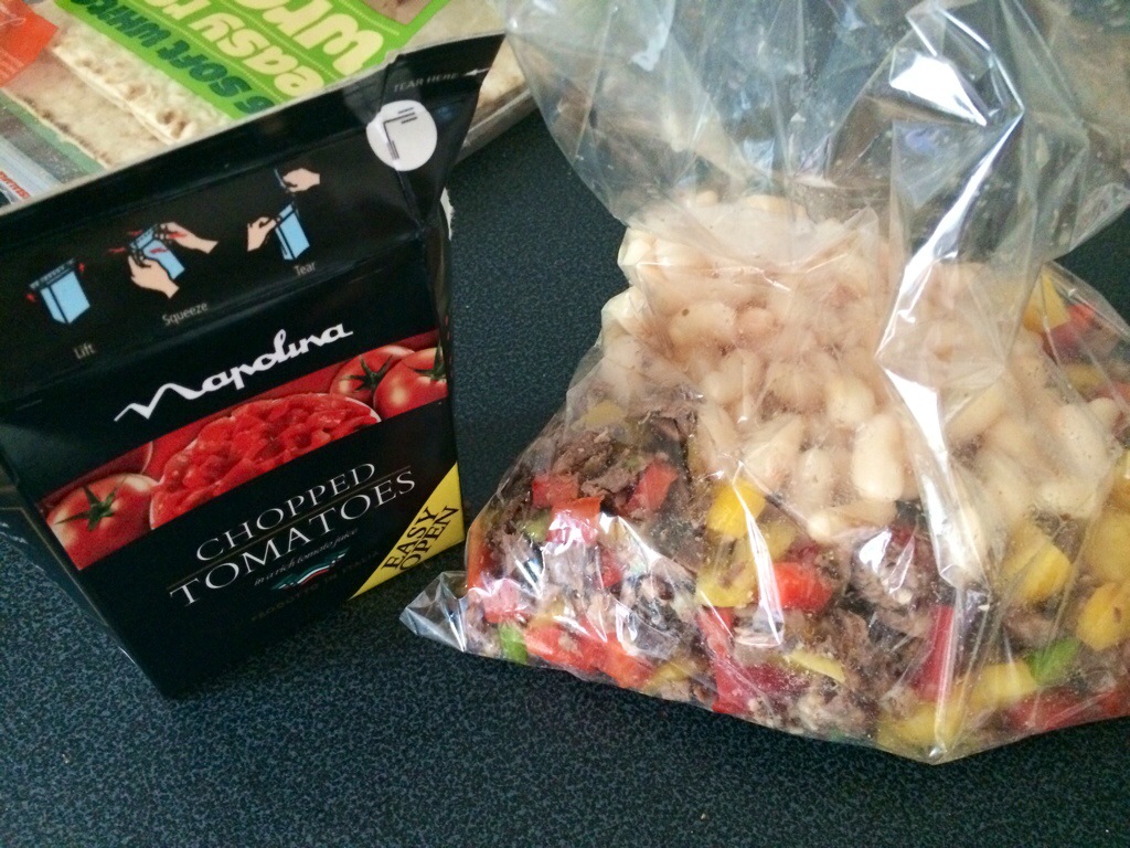 Chopped up red, yellow and green peppers.. added a can of white kidney beans.. I just prefer them to the red ones.. a softer flavour I think? Maybe that’s just me though? a carton of chopped tomatoes,splash of water. chilli spices and creole spices..