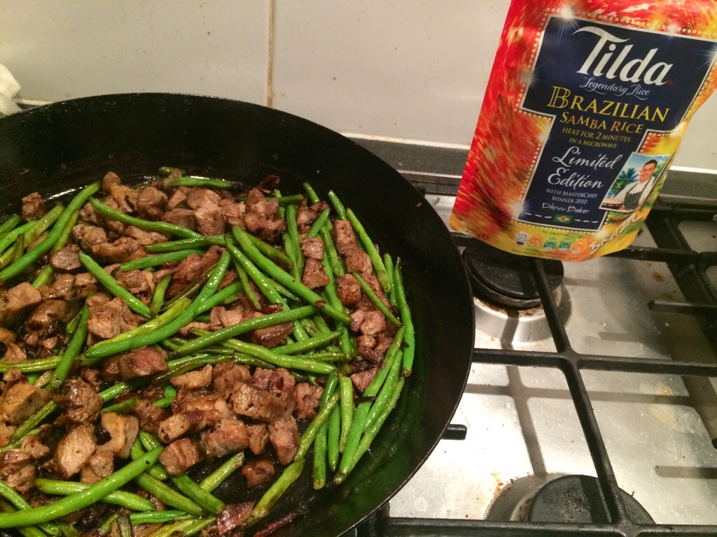 Smelling superb the lamb added to the pan and a good amount of French beans.. Sizzle sizzle sozzle.. (Hic!)