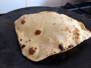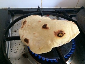 Rolling them out and cooking them on the iron pan.. Hitting them onto the open flame to puff up.. Wrapping them in a tea towel to keep warm..
