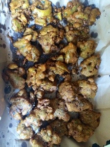 Whatever you like to call the delicious fried vegetarian snack that is onions , herbs and spices in a seasoned gram flour batter..