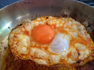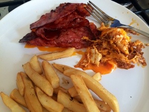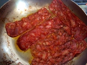 Long strip chorizo.. Fried..a lovely burford buff egg.. And a couple of chef ping chips..