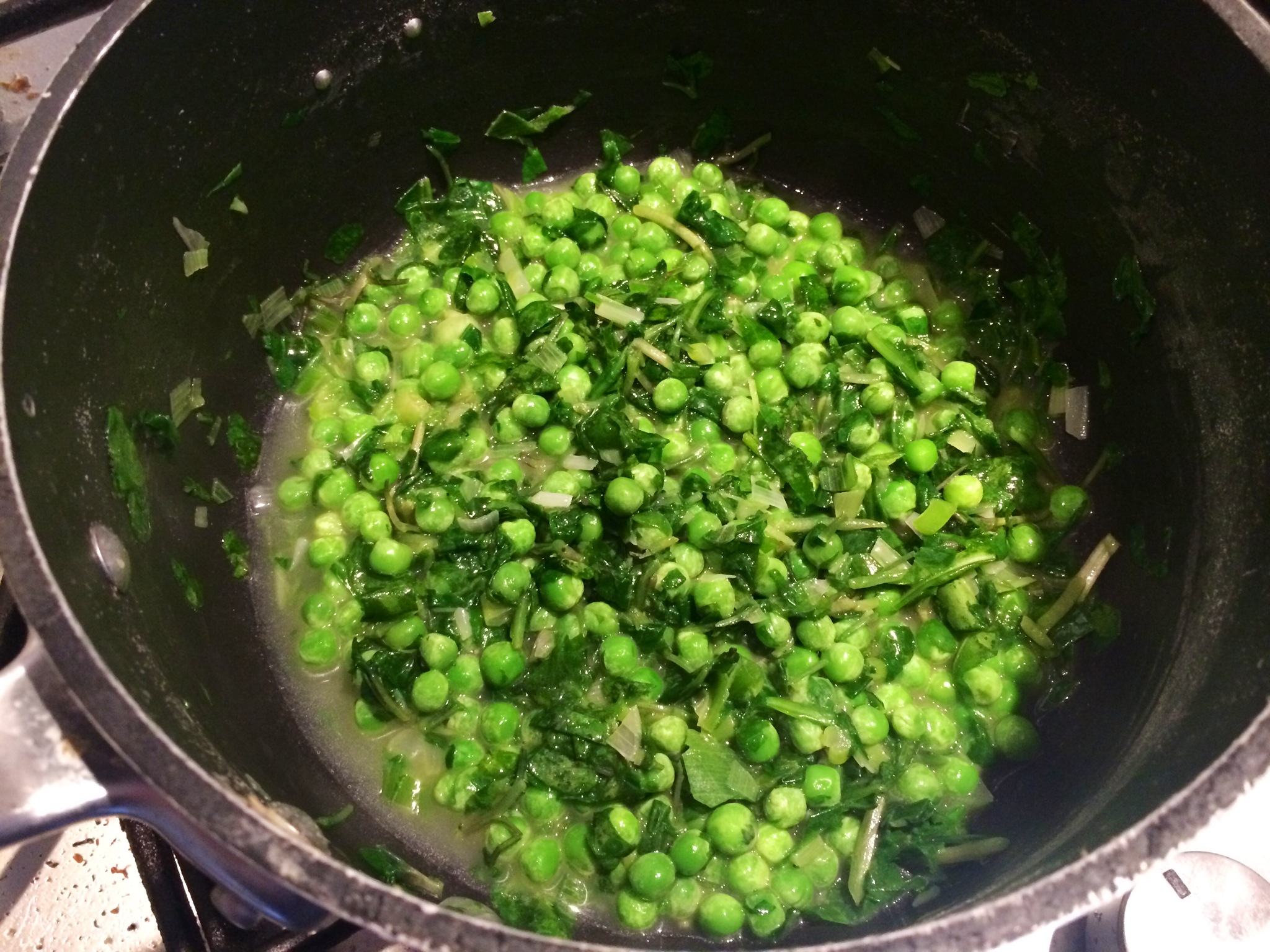 The ‘French’ peas? A spring onion chopped.. Fried in a little butter.. Chopped spinach, rocket and watercress added and wilted.. Veg stock .. And frozen peas.. Petit pois frozen are wonderful !