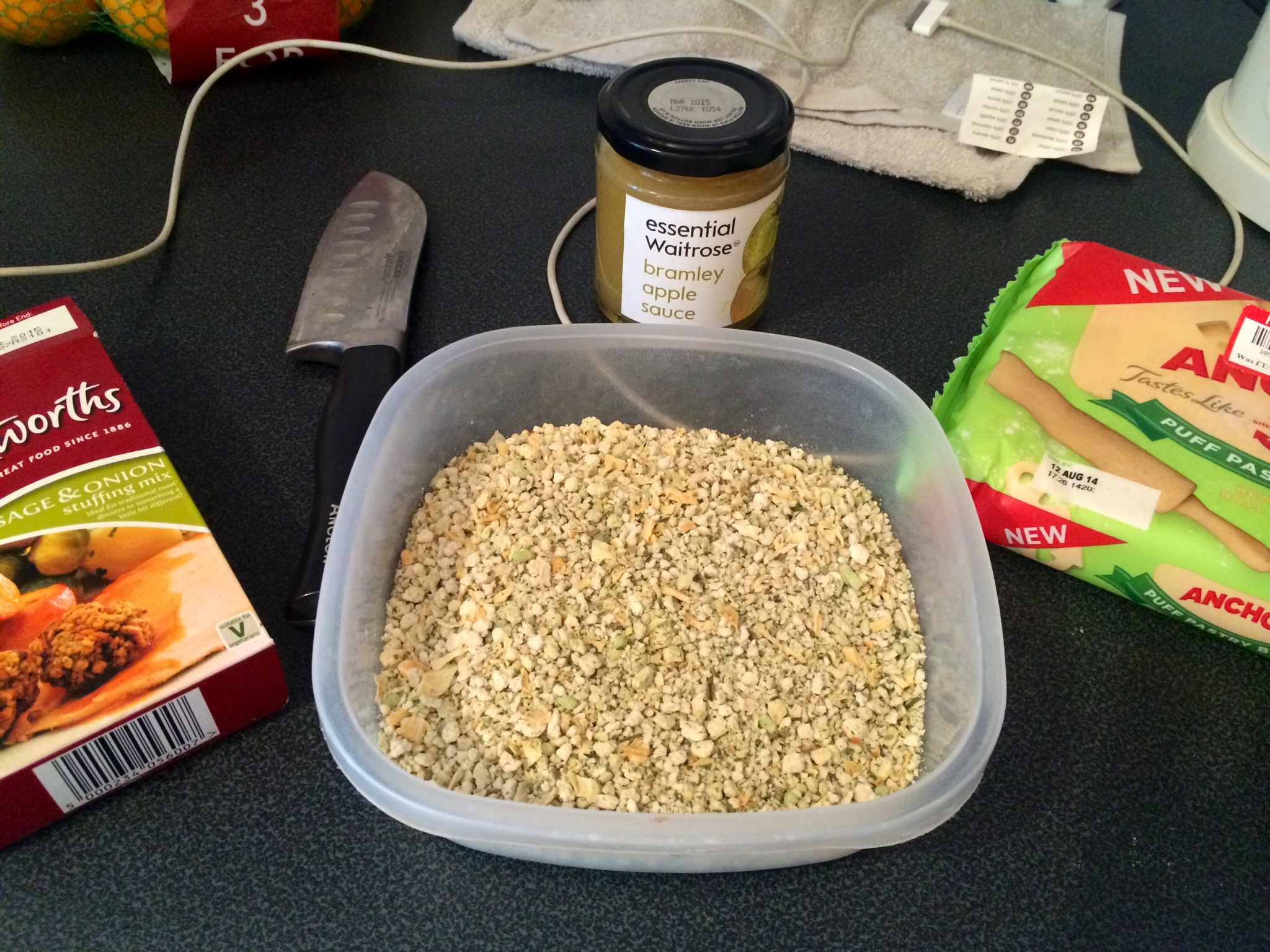 Cheap stuffing pack mixed as per directions.. cheap is better here as you don’t want it too herby not rich otherwise it takes it away from the meat.. Yet you don’t want sawdust cheap either!!
