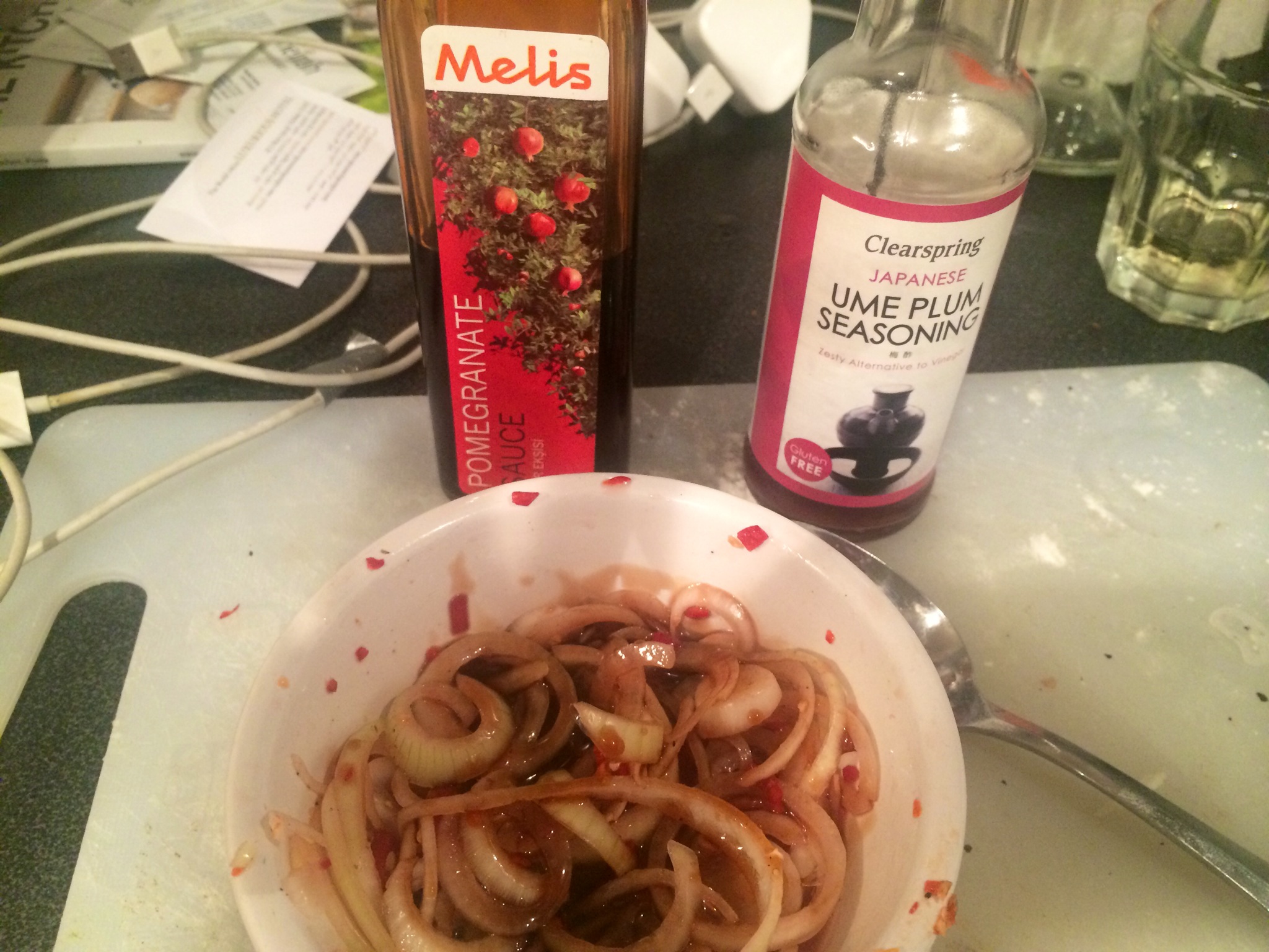 And a side of white onions.. Soused with Ume plum seasoning and pomegranate sauce.. spiked with fresh red chilli ..
