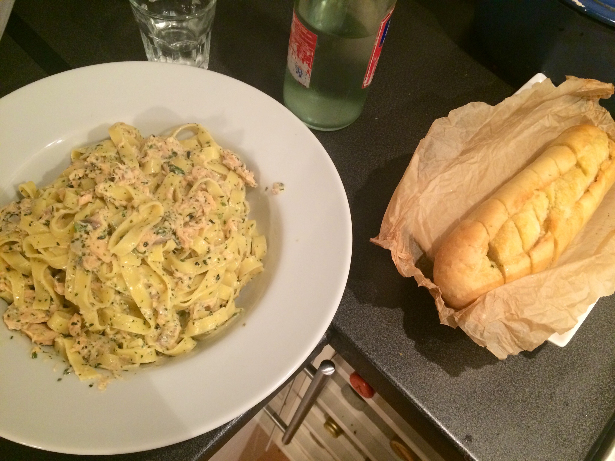 Well Mrs Fitz likes to follow her irish catholic provenance .. So it’s a salmon tagliatelle for her .. Pasta boiled in salty water.. The poached salmon flaked into a pan with Italian frozen herb mix. Bristol blend pepper and double cream added.. A little salt and some pimped mrs Middletons chilli oil to lift it.. With a garlic bread .. There you go.. Bread and fishes huh? ( mind you if I ate fishies I woulda had that too!)..