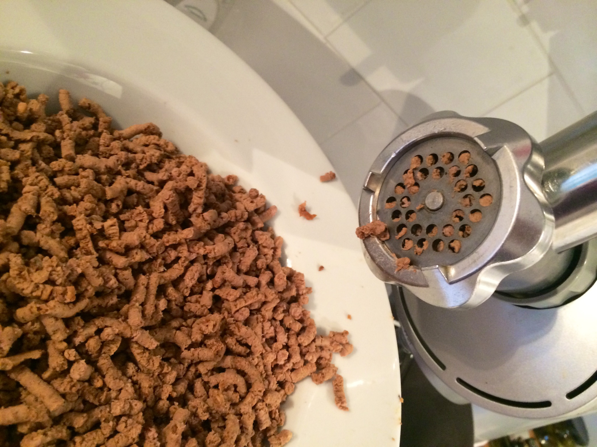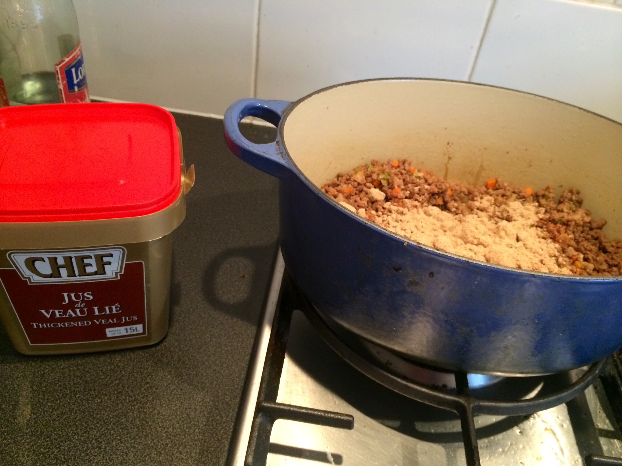 Sweated off carrots, onions & celery adding the ‘mince ‘ and veal jus powder. A squeeze of ketchup and reverse osmosis water.. Umm slight problem here.. It kinda turned to a slurry! Perfect baby food! Or food for the toothless.. So what to do? I need meat texture. .. Hmmm.. Aaahaa!
