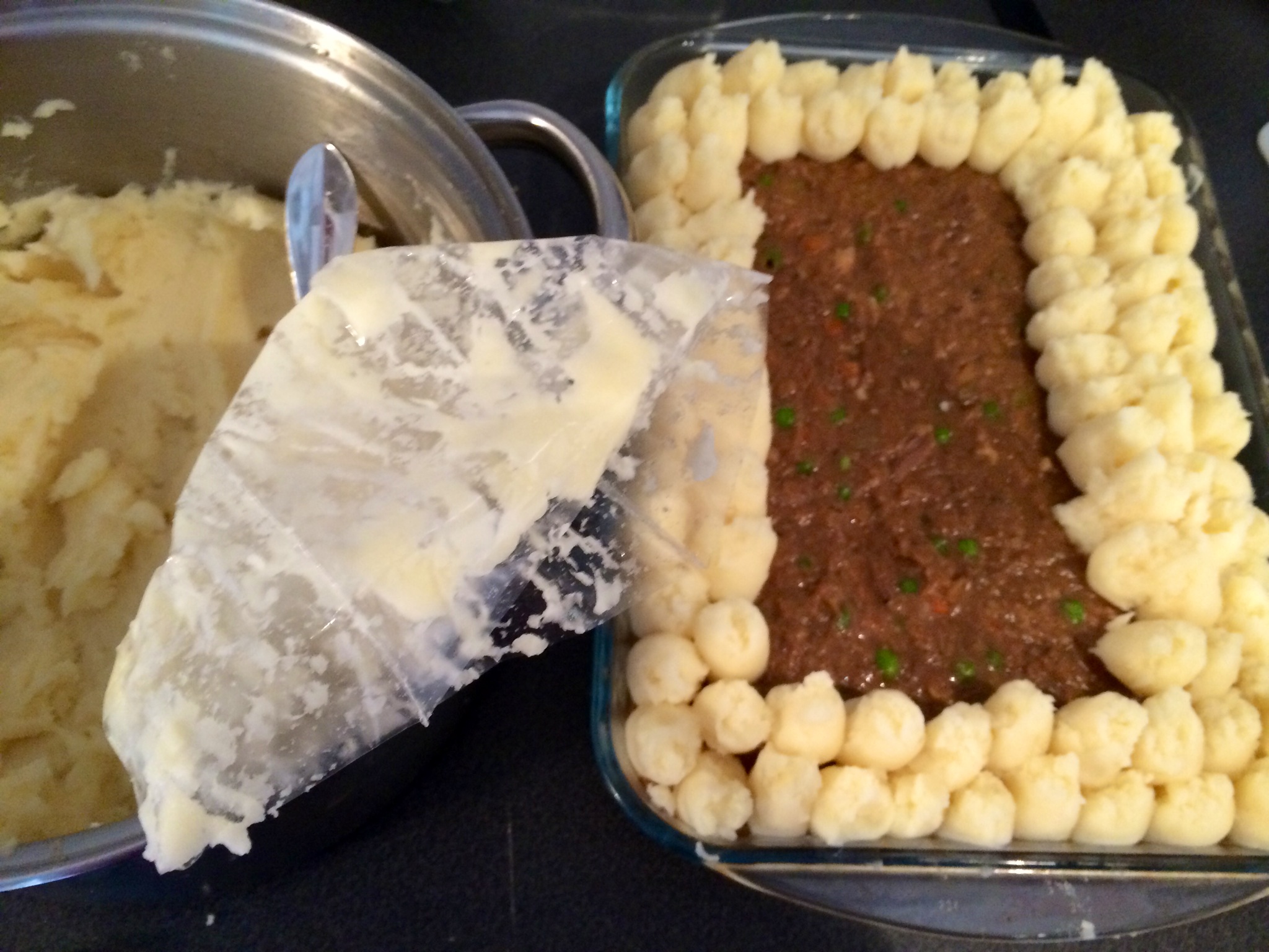 Piped , albeit quite badly onto the Cott-herds pie .. Into the oven..