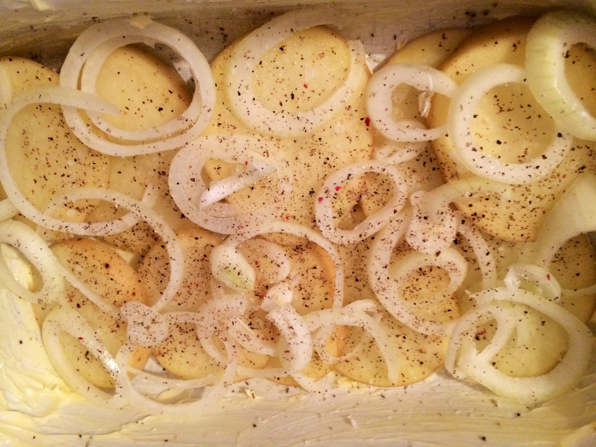 Sliced potatoes first.. Then onion.. Herb de Provence and English sea salt and Bristol blend pepper.. Repeat twice..