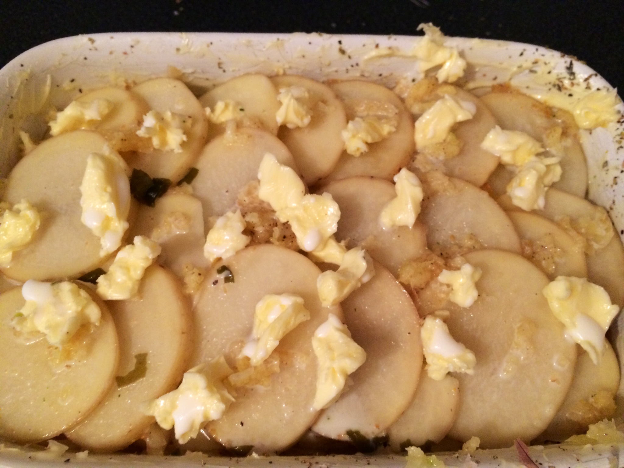 I made a ‘stock of sorts’ from red miso soup mix and chicken stock.. Just a couple hundred mls.. Pour this over the spuds and dot with more butter.. Dribbling milk over the top last thing before putting into the oven at 180 real money for about an hour.. Turning the heat down slightly inbetween..