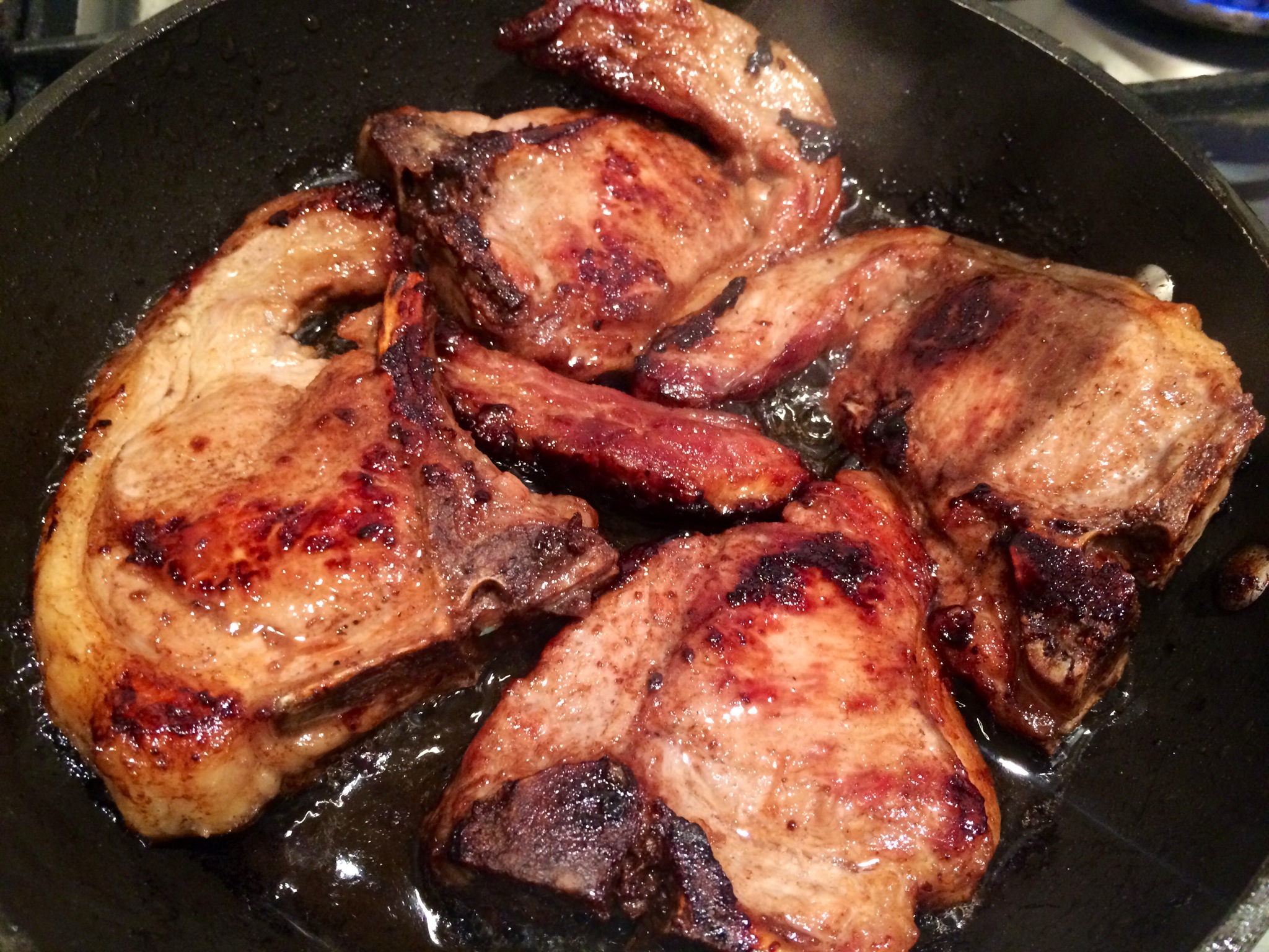 Red ticket lamb chops.. Into a greased pan.. That’s it.. Halfway through cooking add balsamic vinegar and season.. Cream here would make the best sauce yet we are running the home food stash down at the moment.. Let that bubble about for a bit.. Get a little hot and sticky.. And there you have it.. Balsamic glazed lamb chops..