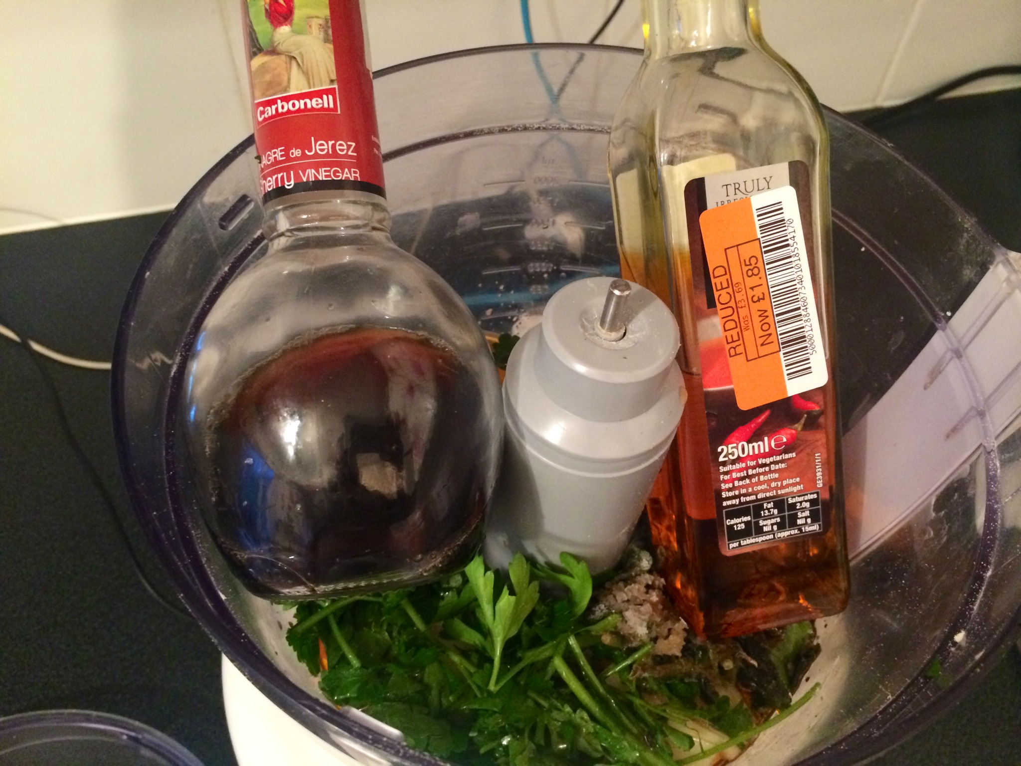 Mrs Fitz kindly blitzed up a Chimchurri of sorts .. Parsley, garlic, salt, oregano oil and sherry vinegar..