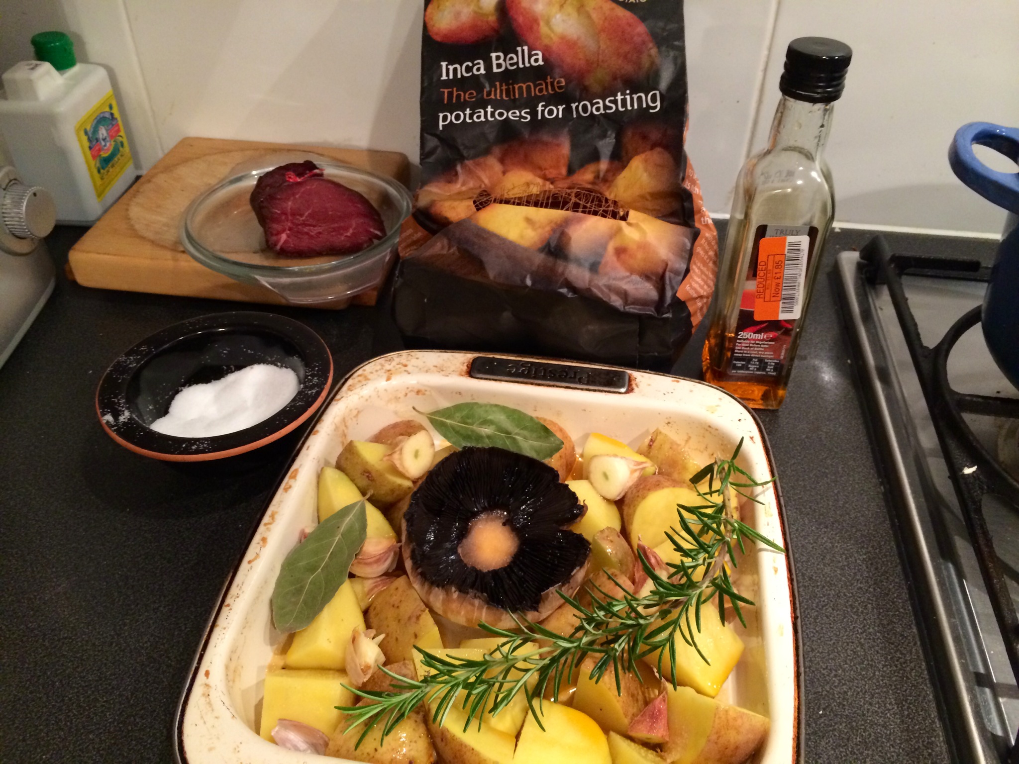 The inca bella potatoes simply cut.. Into the tray with purple French garlic , garden rosemary, bay leaves and chilli oil.. A mushroom for good measure and a sprinkle of broth powder.. ( am all out of mrs Middletons which would have made these sing! )..