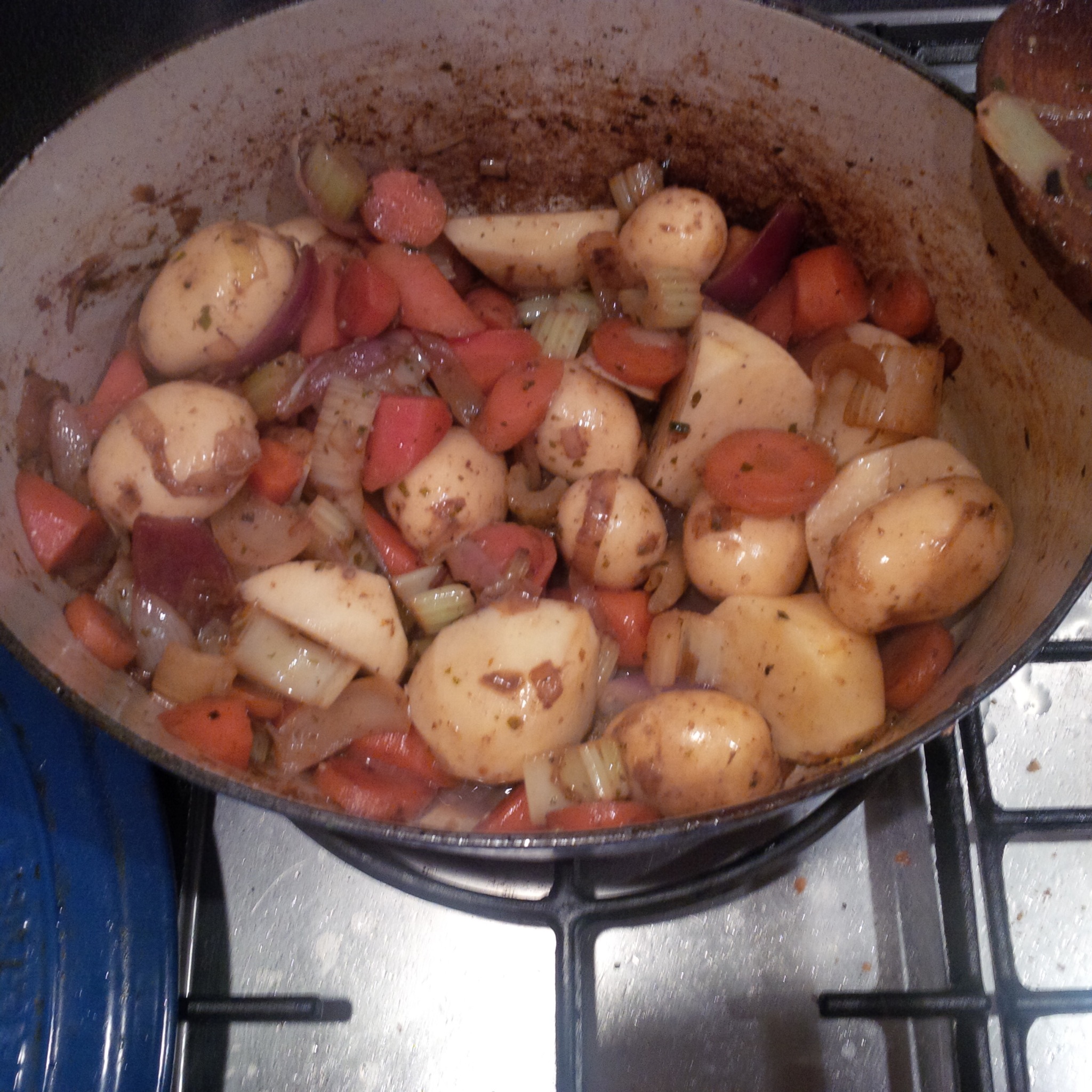 The lamb chops are rendered down and the day added to the veggies.. (Yummy stage!!)..